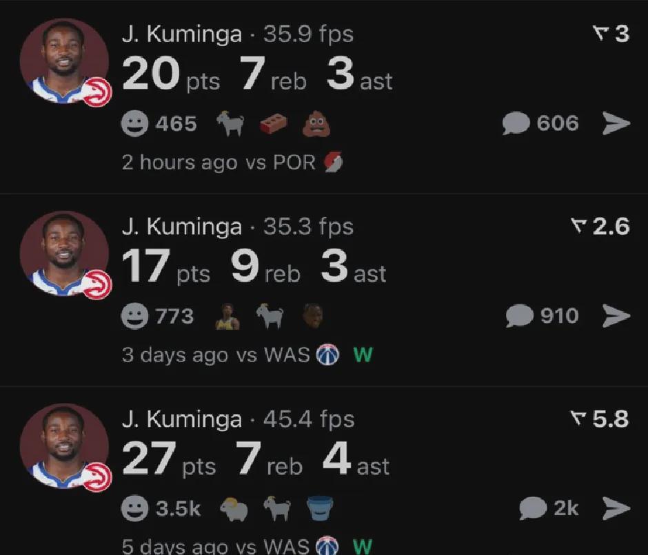 离开勇士效力老鹰的库明加,真的很开心,时时刻刻都笑容满面。这哥们和希尔德在今年交易截止日前一起被勇士送至老鹰,换回24年总冠军空间型内线波尔津吉斯。迄今为止库明加为老鹰出战三场比赛首发1次全部取胜,分别贡献27分7板4助2断、17分9板3助1断1帽,和20分7板3助2断,三战投篮合计31中21,命中率高达约68%,其中三分球合计9中5,命中率达到约56%。人...